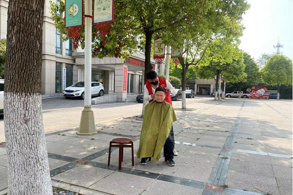 青年志愿者王帅:“疫情无情人有情,我乡疫情防控工作人员舍小家顾大家,每日连续工作十多个小时,已经持续战斗了30天。我很感谢他们!我今天从下午2点一直忙到将近5点,给15位职工理了发,虽然感觉有点累,但心里却很高兴。我要用义务为职工理发这种方式表达对他们的敬意,同时也要为疫情防控尽一份绵薄之力。”